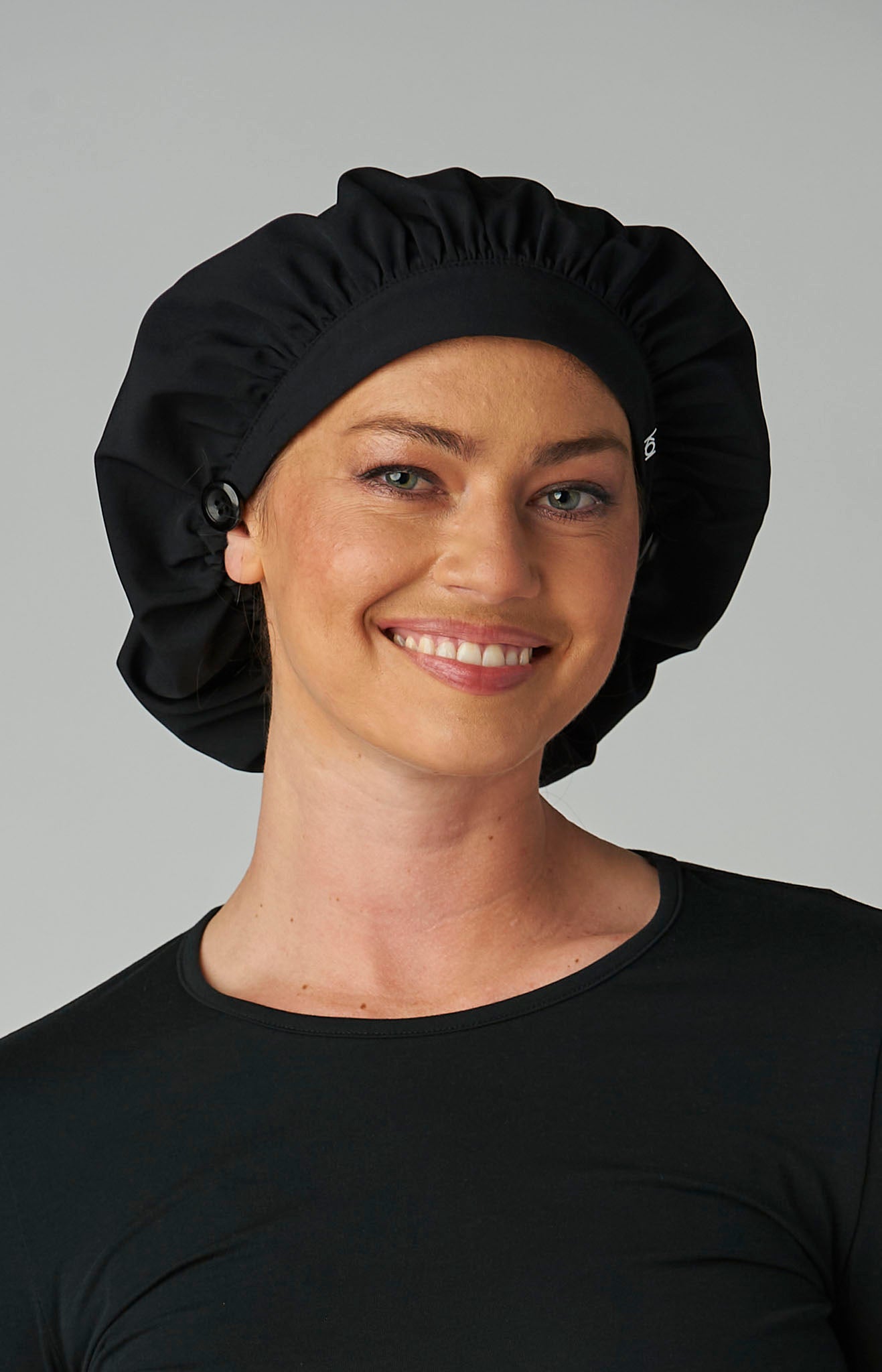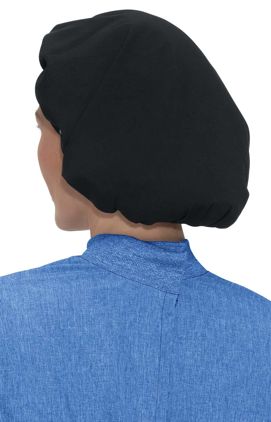 Stylish bouffant scrub cap with stretch for comfort and easy fit.