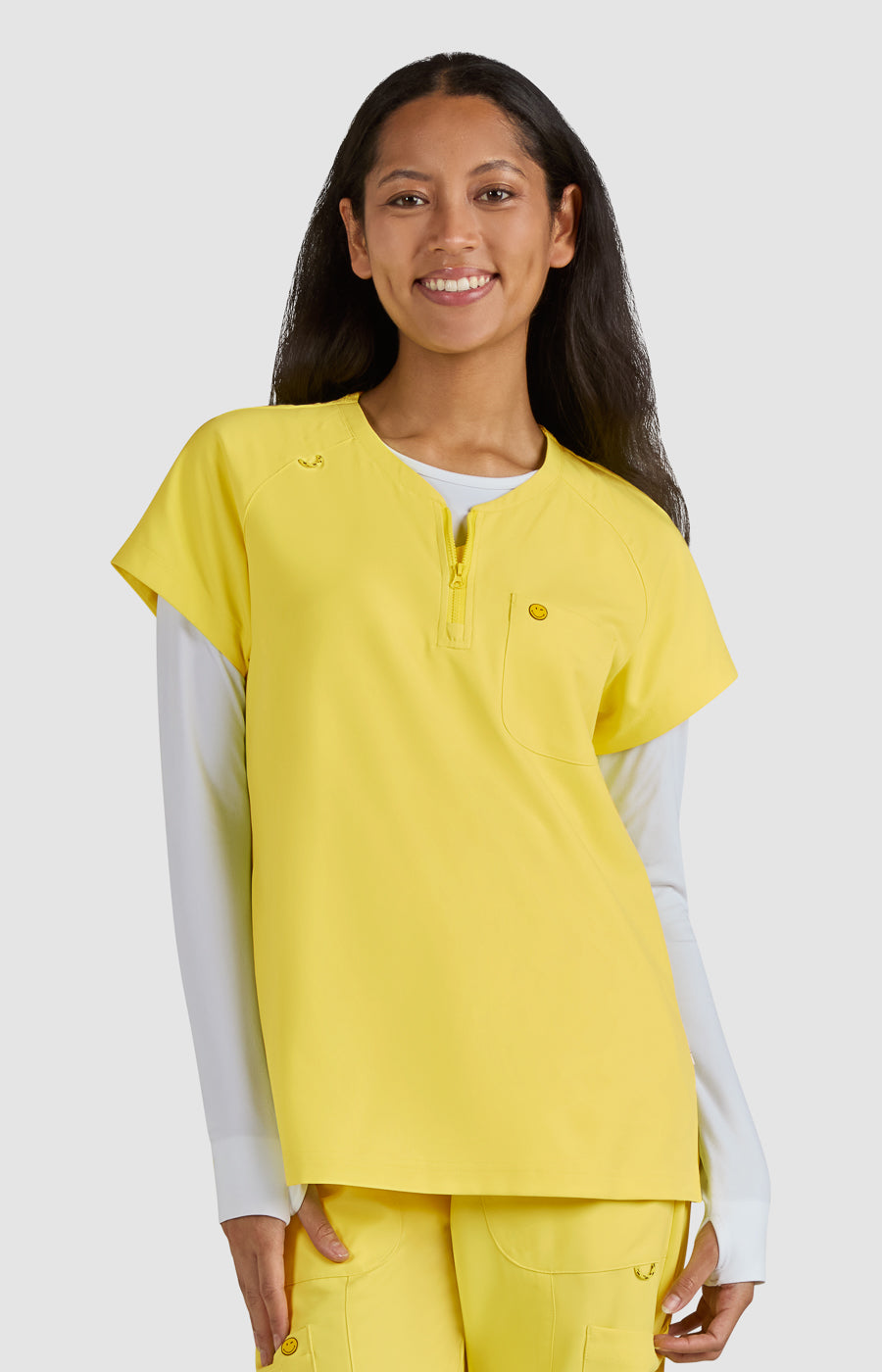 koi | SmileyWorld Ecstatic Women's 1-Pocket Zipper-Neck Scrub Top