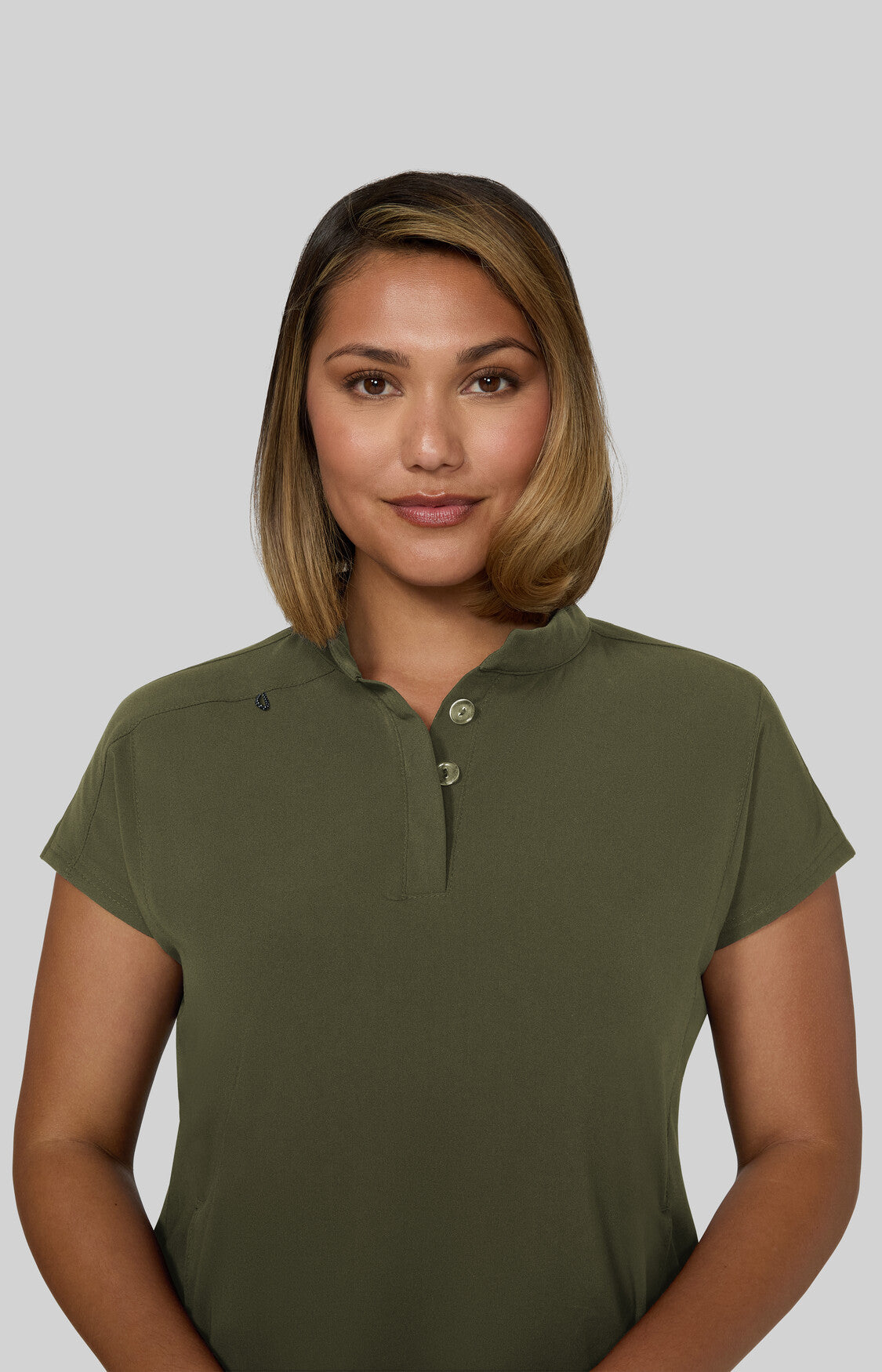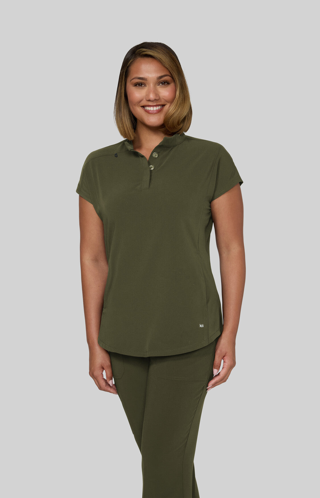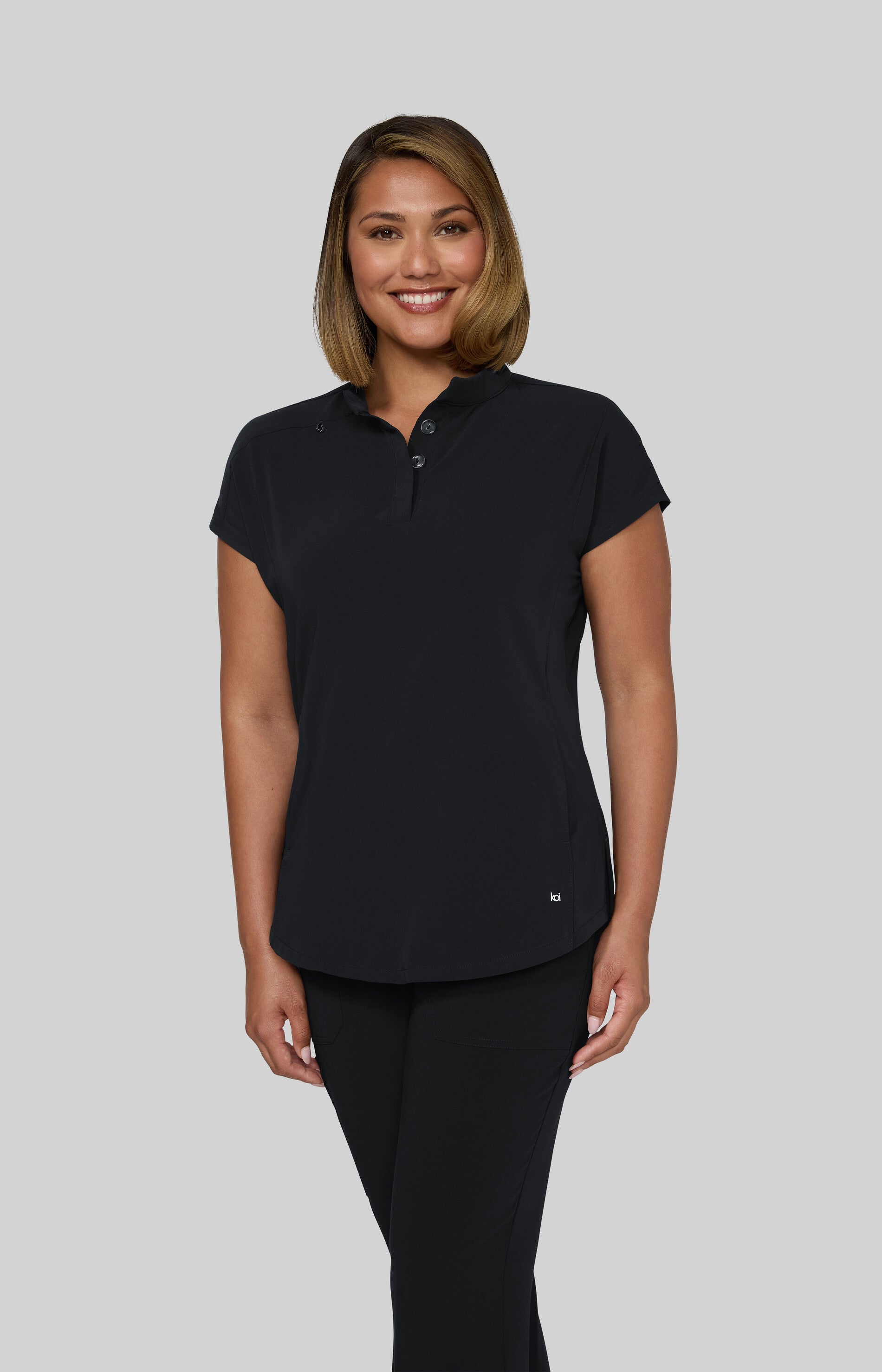 Take on the day with this sleek, modern women's scrub top designed to power you through even the busiest shifts. Featuring a high neck collar with a hidden button closure, dolman cap sleeves, ID badge loop ,and 2 front inseam pockets to keep your essentials close at hand. Made with our signature koi Next Gen 4-way stretch fabric, it features a soft brushed finish and advanced moisture-wicking that keeps you cool, calm, and collected even under pressure. Contemporary fit.