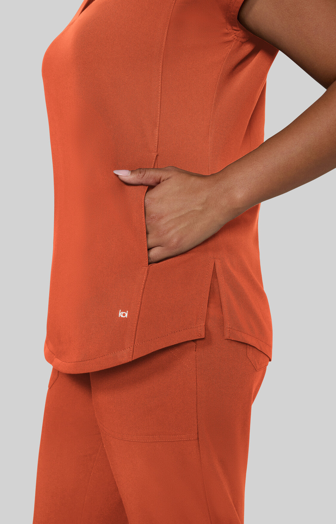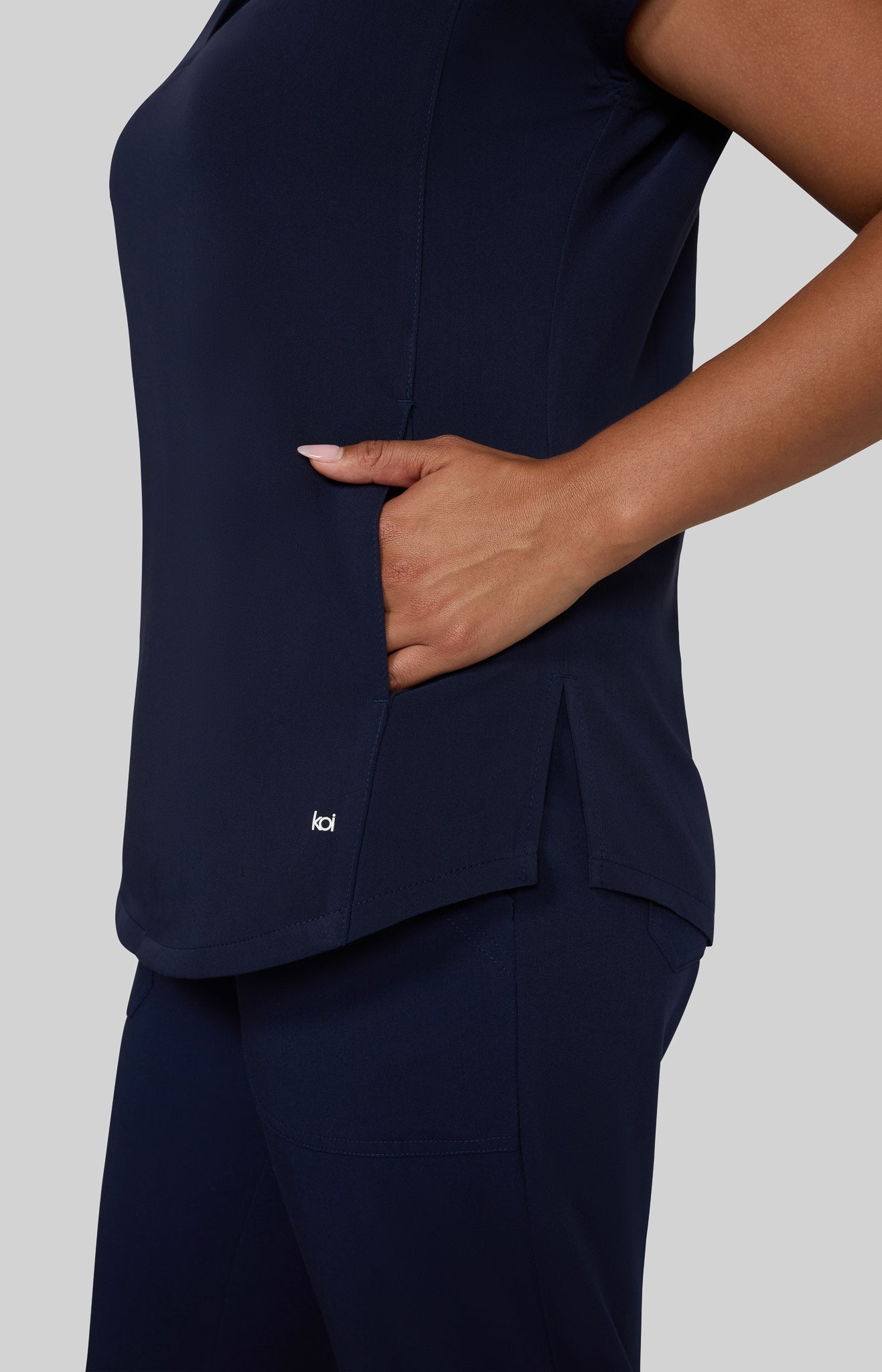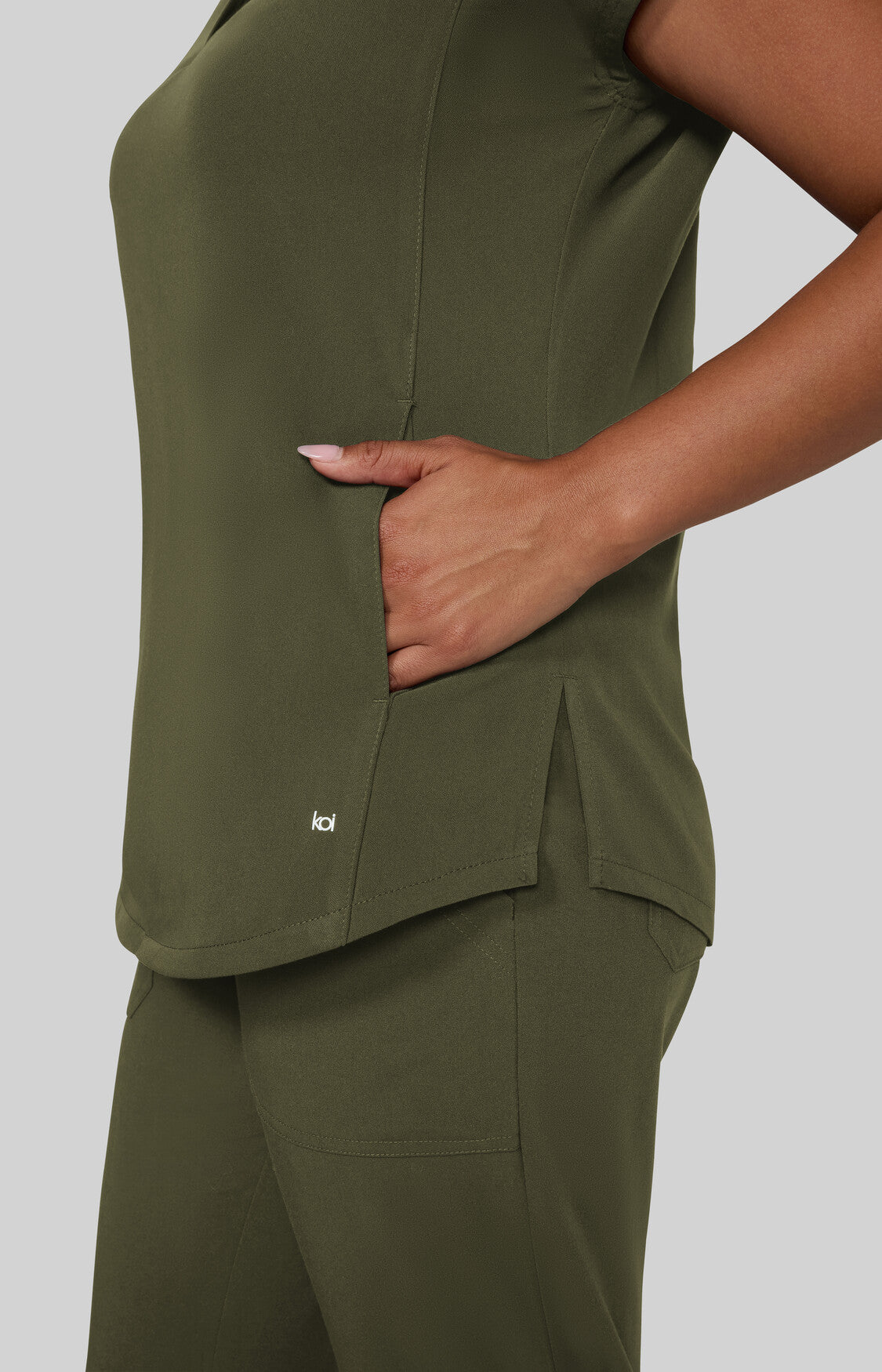 Take on the day with this sleek, modern women's scrub top designed to power you through even the busiest shifts. Featuring a high neck collar with a hidden button closure, dolman cap sleeves, ID badge loop ,and 2 front inseam pockets to keep your essentials close at hand. Made with our signature koi Next Gen 4-way stretch fabric, it features a soft brushed finish and advanced moisture-wicking that keeps you cool, calm, and collected even under pressure. Contemporary fit.