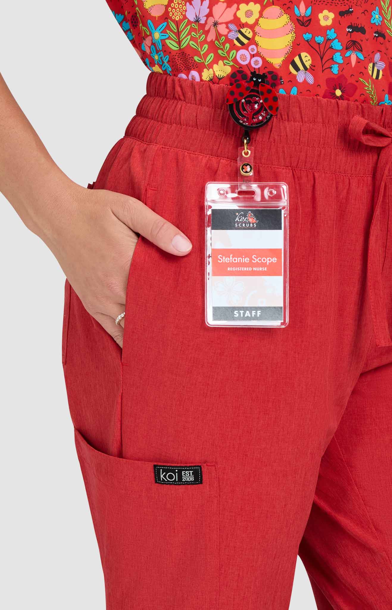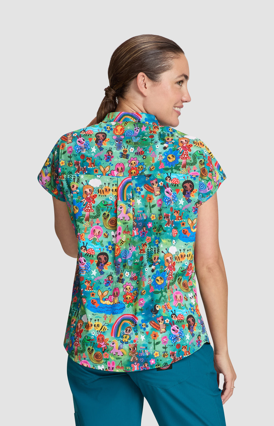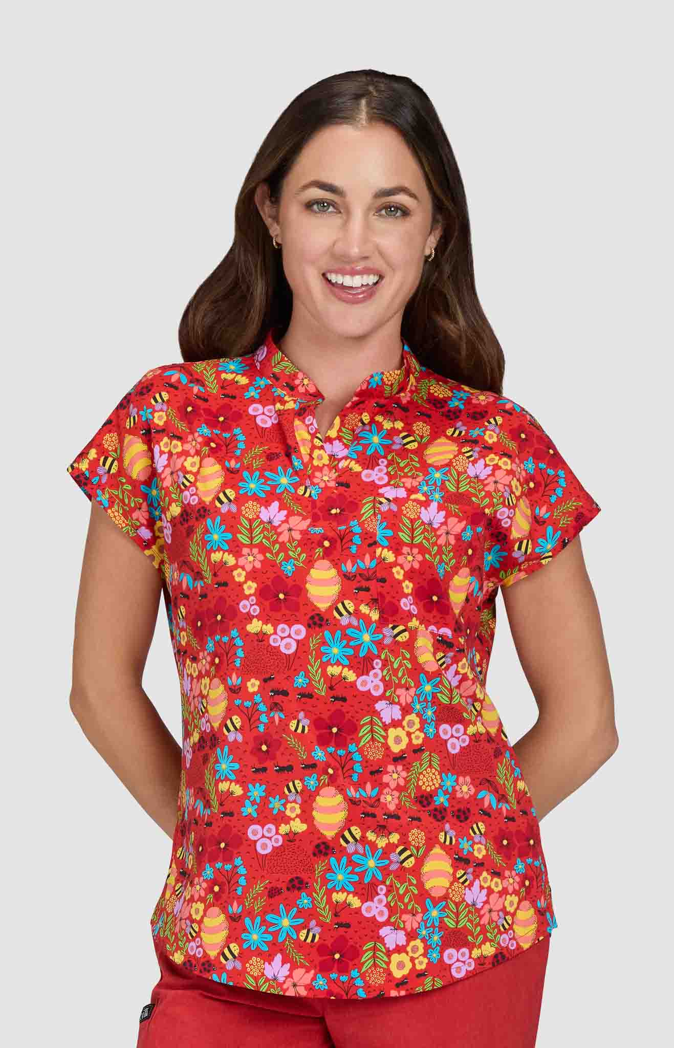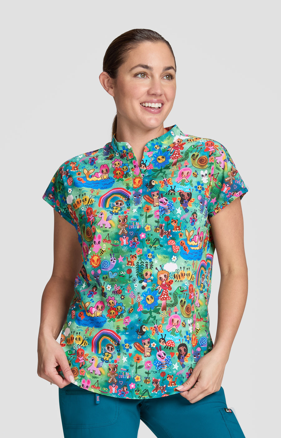 This unique, contemporary stretch print scrub top from the koi Artists Series Series is part of our exclusive collab with the lifestyle brand I Scream Colour. The brainchild of San Diego-based graphic designer and illustrator Humberto Cruz, the brand blends elements of pop culture, fashion, and color into designs that are spontaneous, quirky, and fun. This limited edition top features a stylish split neckline, cap sleeves, a slightly shaped silhouette, and a chest pocket for easy access. Looks great tucked in or out.