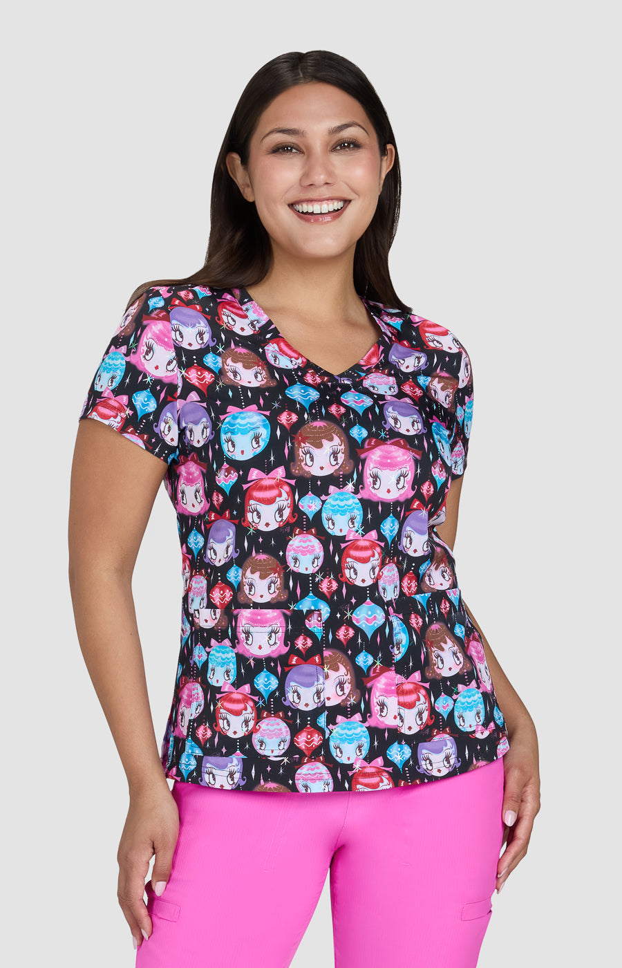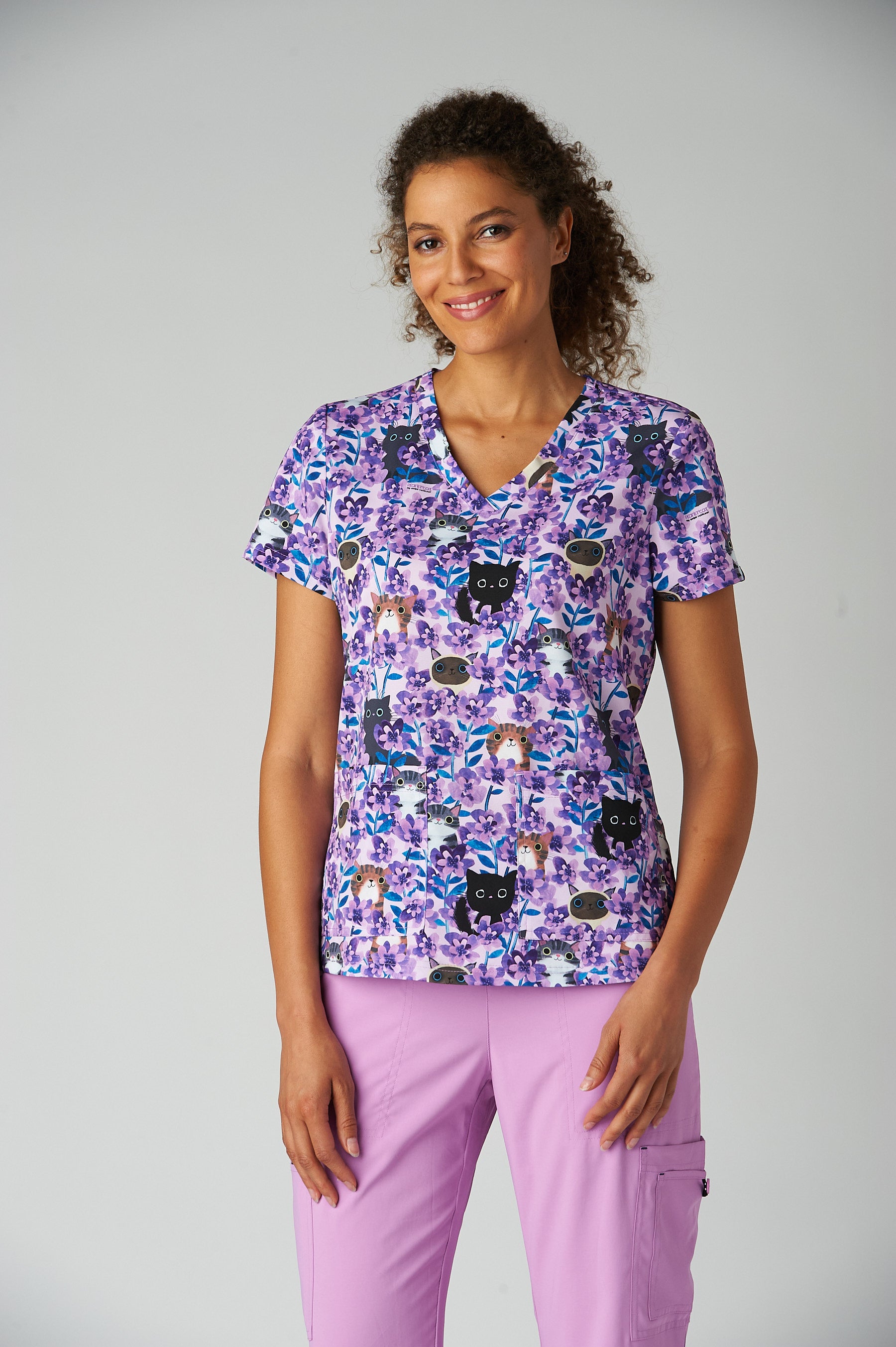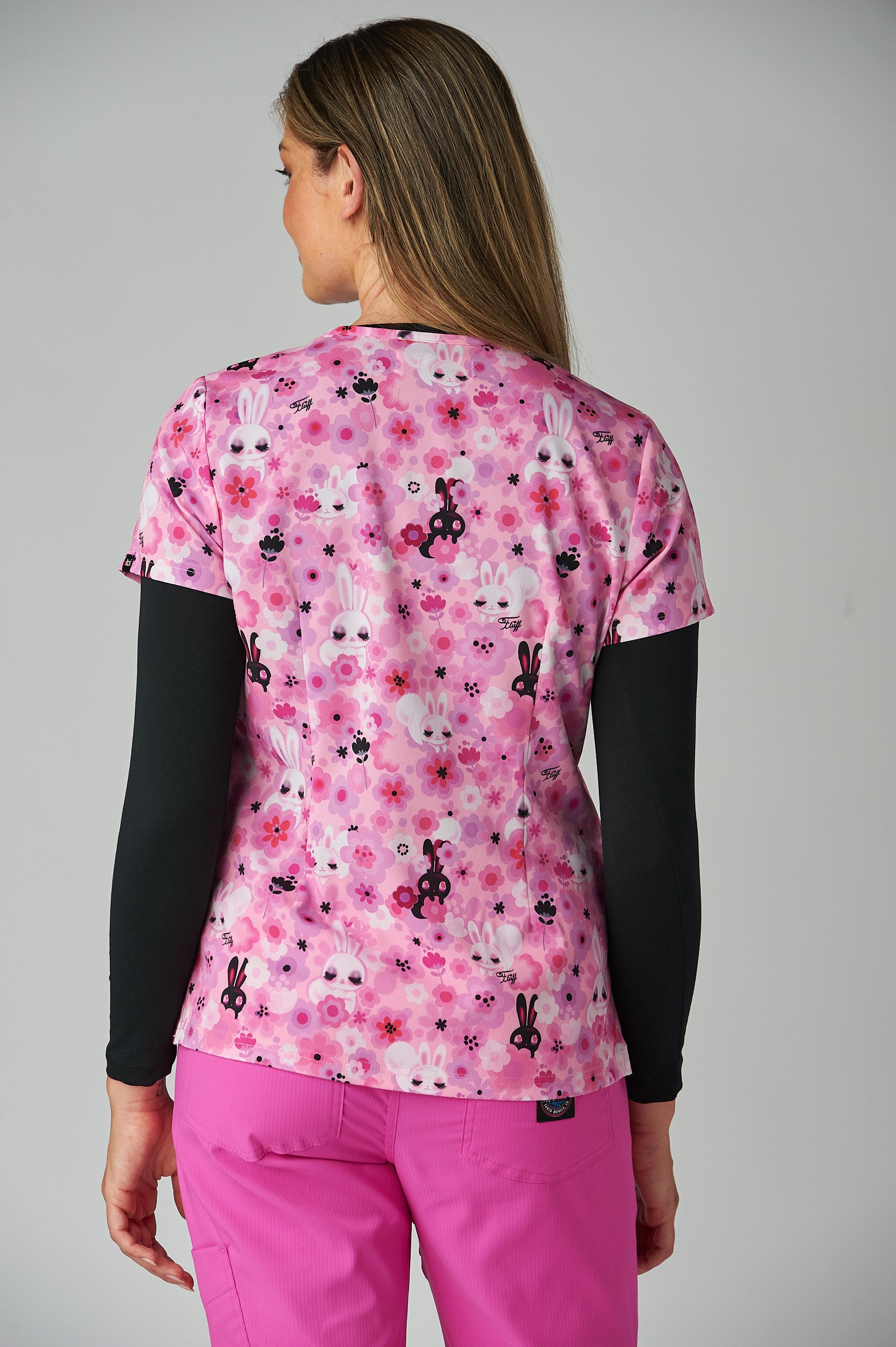 This sporty, contemporary stretch print scrub top from the koi Artists Series is part of our awesome and exclusive collab with the lifestyle brand Fluff. Created by artist Claudette Barjoud, aka Miss Fluff, the brand takes inspiration from all things vintage, including classic cartoons and toys, rockabilly, pin-up art, and mid-century modern design. This limited edition top features a classic v-neckline, 2 front pockets for your essentials, and side slits for ease of movement.
