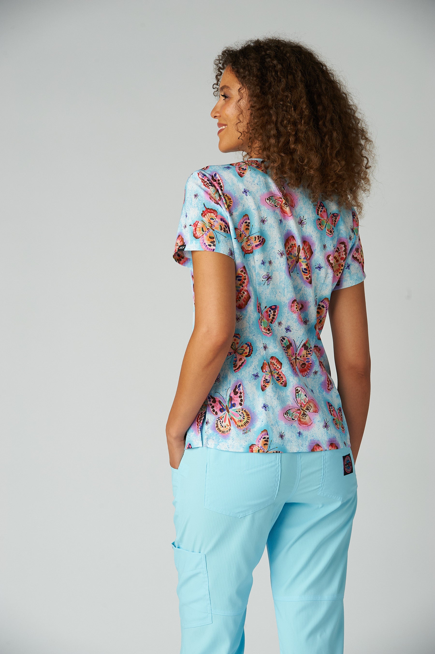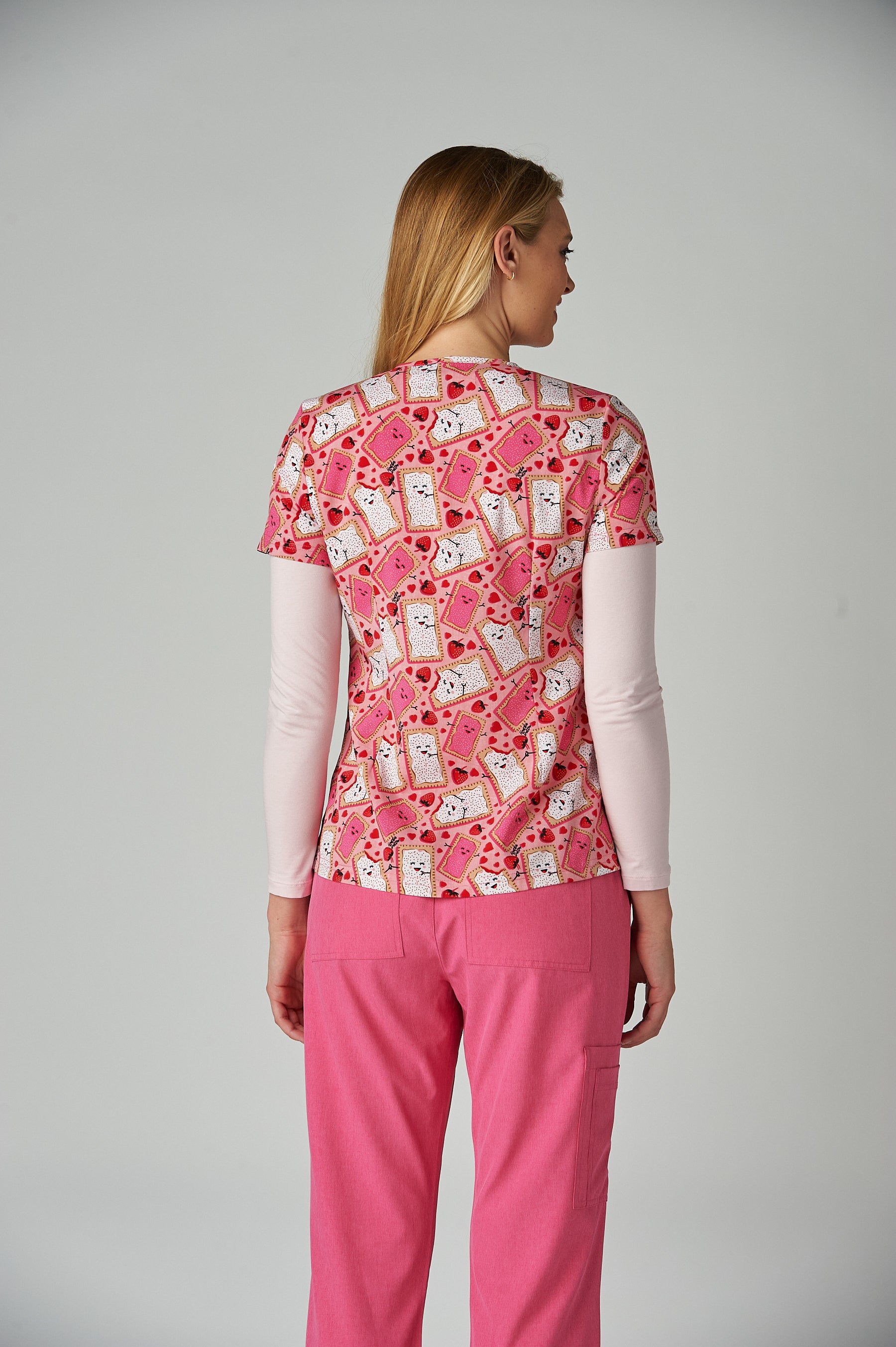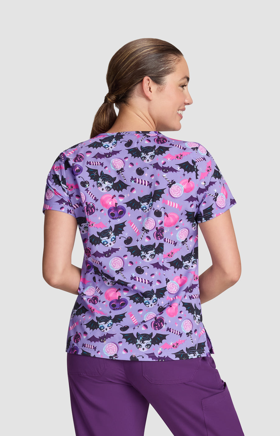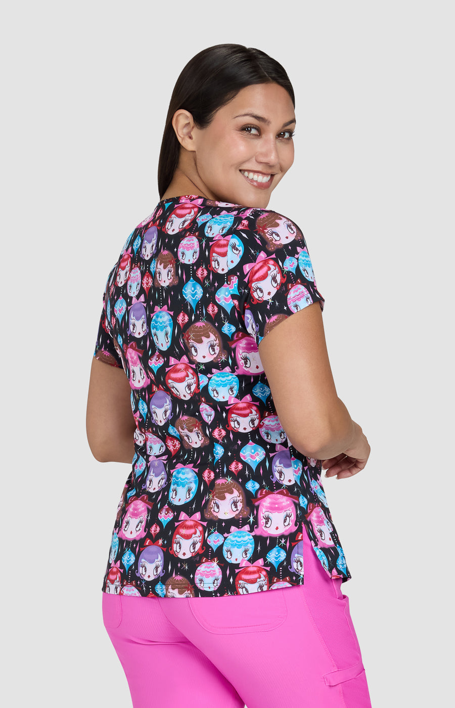 This sporty, contemporary stretch print scrub top from the koi Artists Series is part of our awesome and exclusive collab with the lifestyle brand Fluff. Created by artist Claudette Barjoud, aka Miss Fluff, the brand takes inspiration from all things vintage, including classic cartoons and toys, rockabilly, pin-up art, and mid-century modern design. This limited edition top features a classic v-neckline, 2 front pockets for your essentials, and side slits for ease of movement.