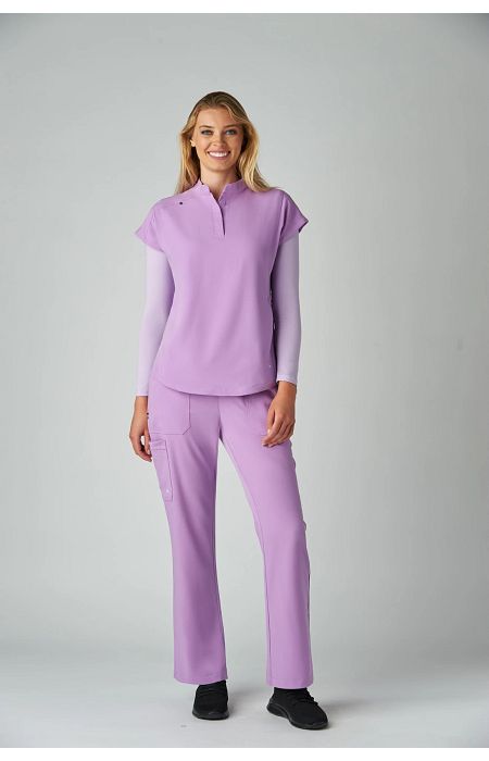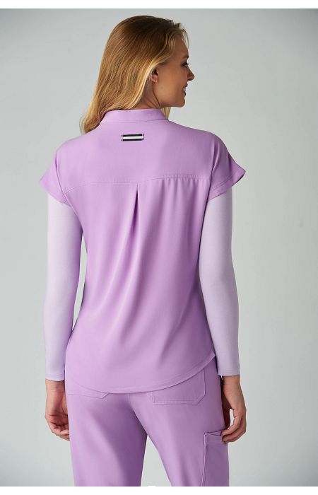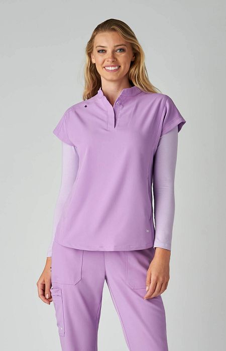 Take on the day with this sleek, modern women's scrub top designed to power you through even the busiest shifts. Featuring a high neck collar with a hidden button closure, dolman cap sleeves, ID badge loop ,and 2 front inseam pockets to keep your essentials close at hand. Made with our signature koi Next Gen 4-way stretch fabric, it features a soft brushed finish and advanced moisture-wicking that keeps you cool, calm, and collected even under pressure. Contemporary fit.